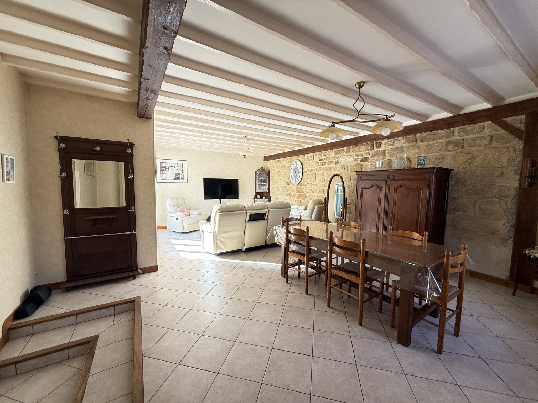 Édifiée en pierres apparentes, elle développe environ 110 m² habitables et 165 m² au sol, offrant de beaux volumes et un fort potentiel d’aménagement.